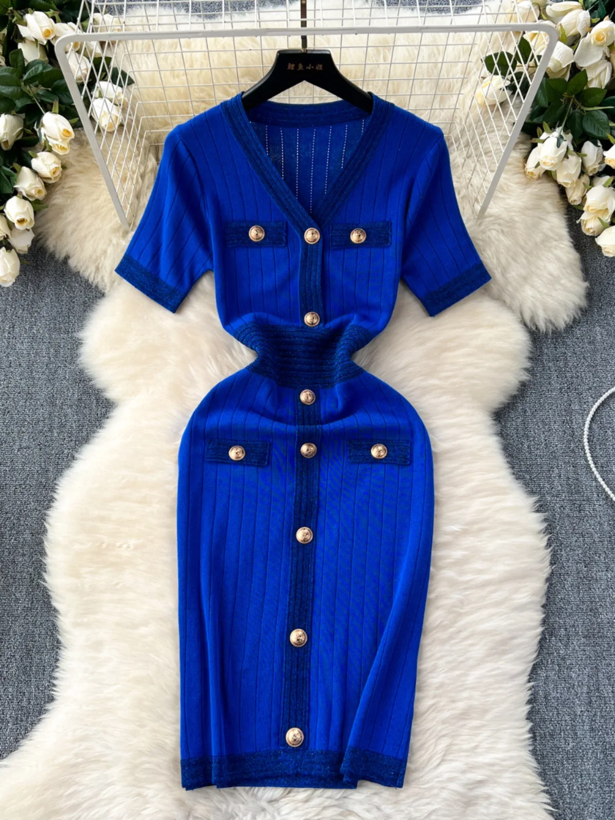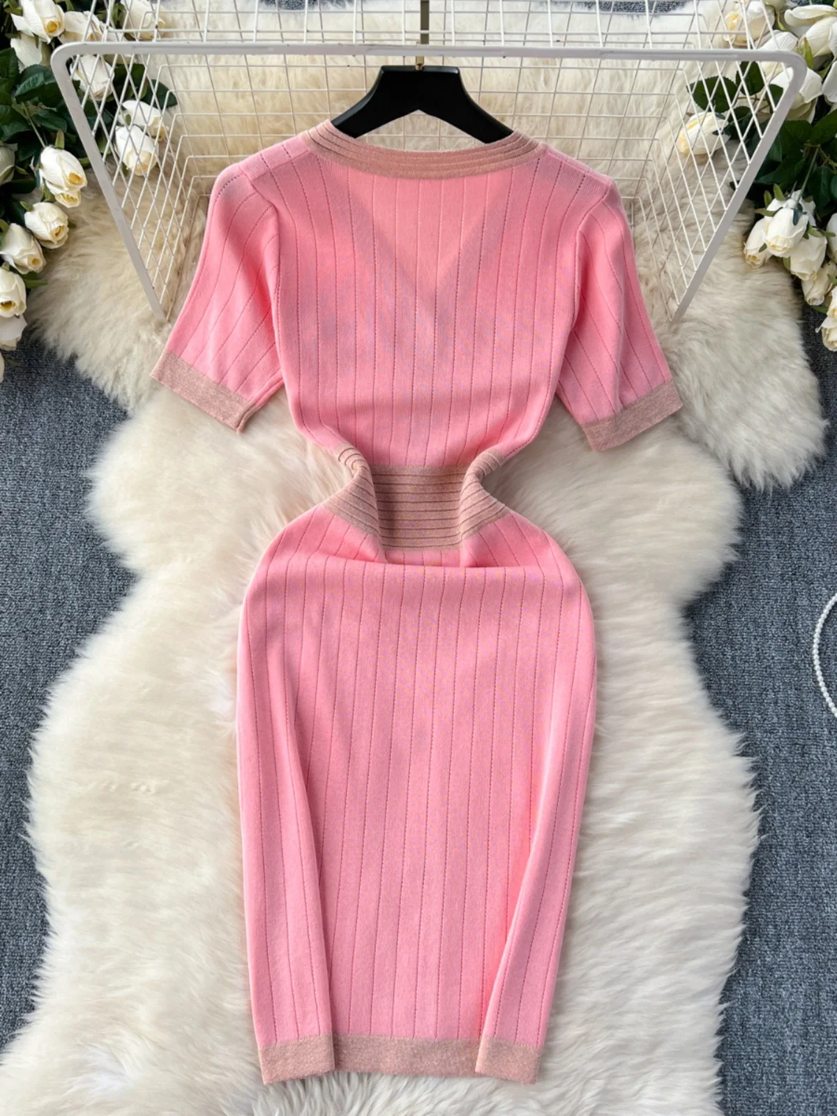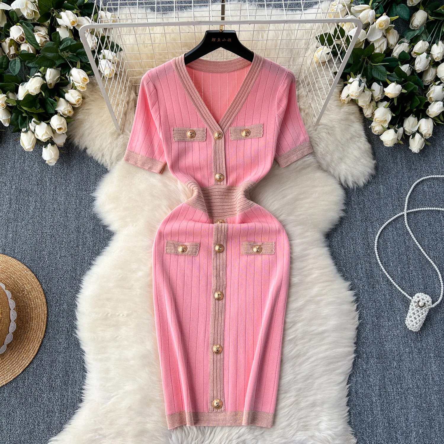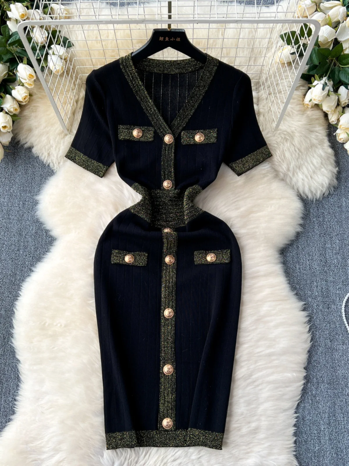 Women's Casual Midi Length Knitted Dress for Autumn Summer Elastic Slim Silhouette Simple Fashion Short Sleeves Buttons Woven